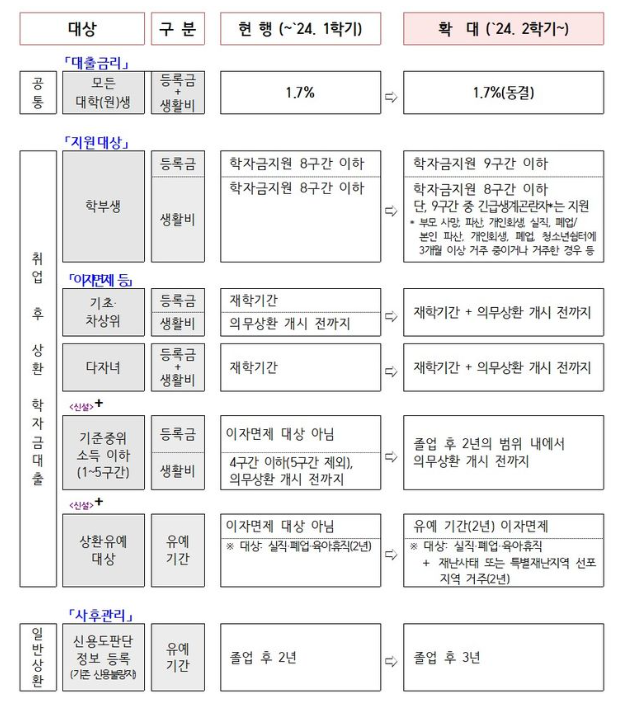 기초, 차상위 및 다자녀의 경우 '재학기간'에서 '재학기간 + 의무상환 개시 전' 까지로 확대 시행